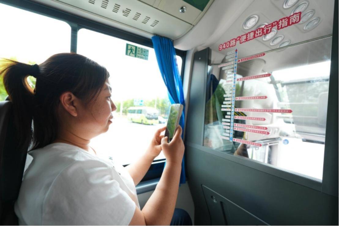 走进940路车厢,内壁张贴着清晰醒目的服务标识,上面详细标注沿线医院、学校、景点、地铁站等关键站点,乘客抬头即可看到目的地站位信息。